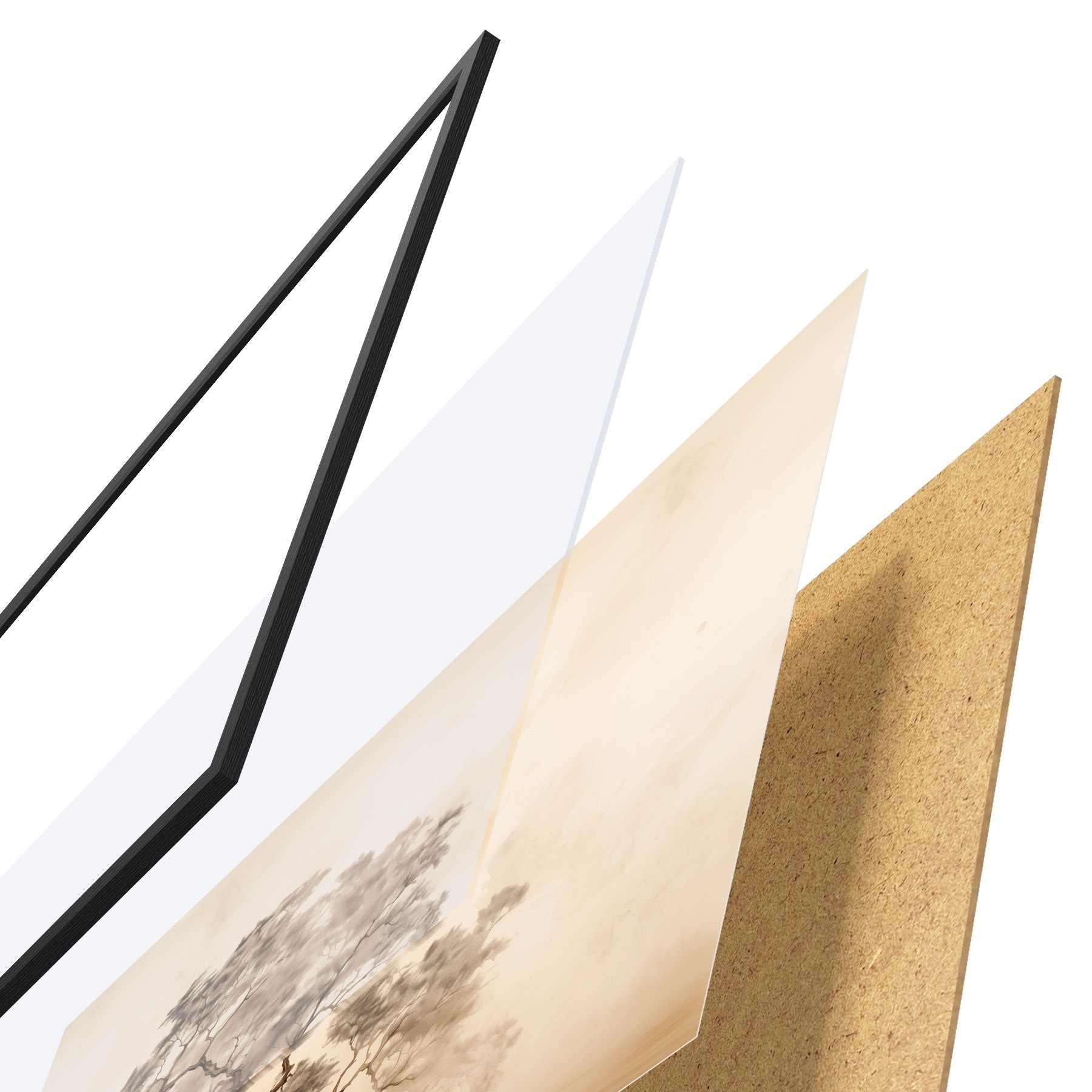 Das Poster besteht aus einem Rahmen, Plexiglas, einem gedruckten Bild und einer Rückwand aus Spanplatten. Dank der Halterungen auf der Rückseite kann das Poster sofort an die Wand gehängt werden.