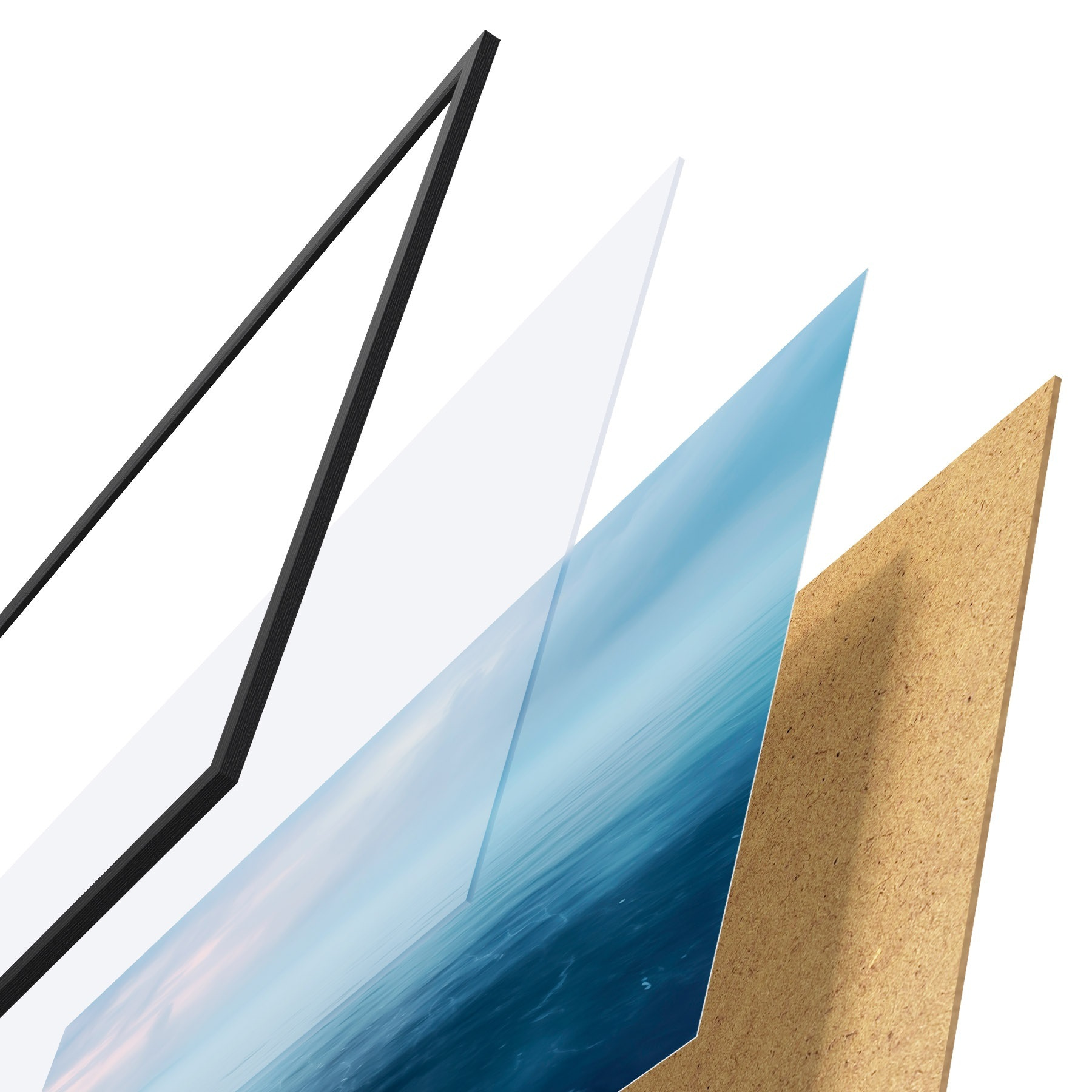 Das Poster besteht aus einem Rahmen, Plexiglas, einem gedruckten Bild und einer Rückwand aus Spanplatten. Dank der Halterungen auf der Rückseite kann das Poster sofort an die Wand gehängt werden.