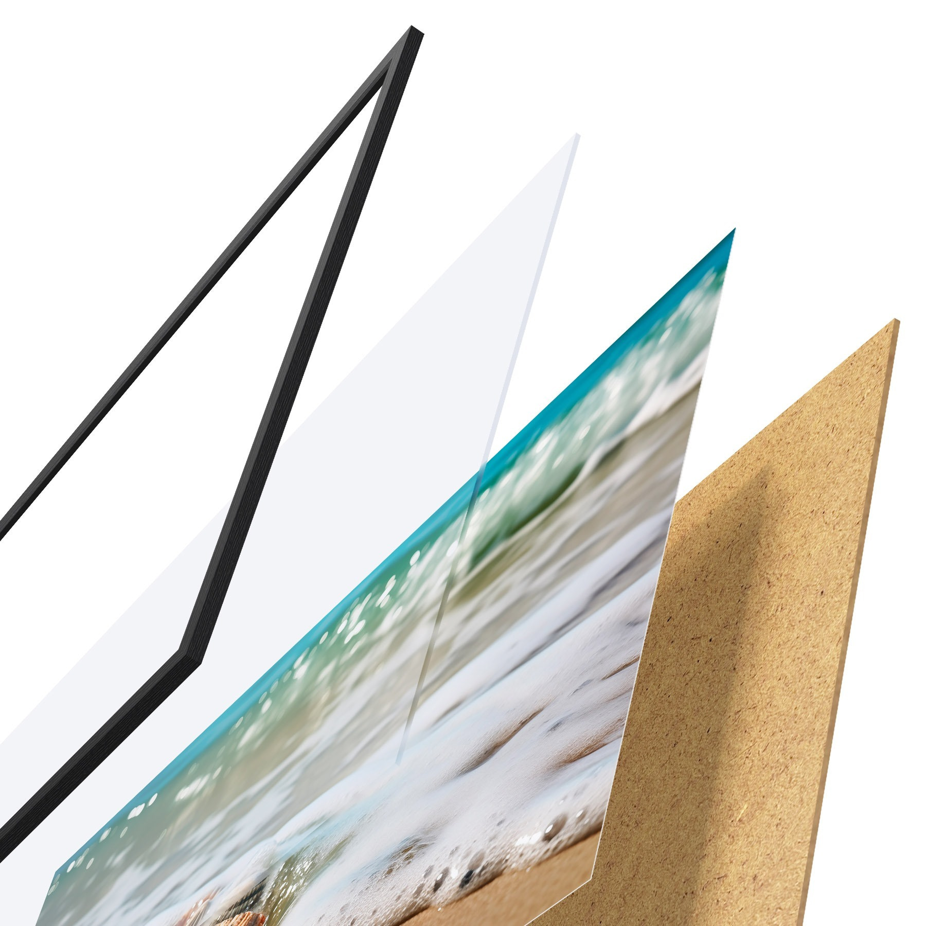 Das Poster besteht aus einem Rahmen, Plexiglas, einem gedruckten Bild und einer Rückwand aus Spanplatten. Dank der Halterungen auf der Rückseite kann das Poster sofort an die Wand gehängt werden.