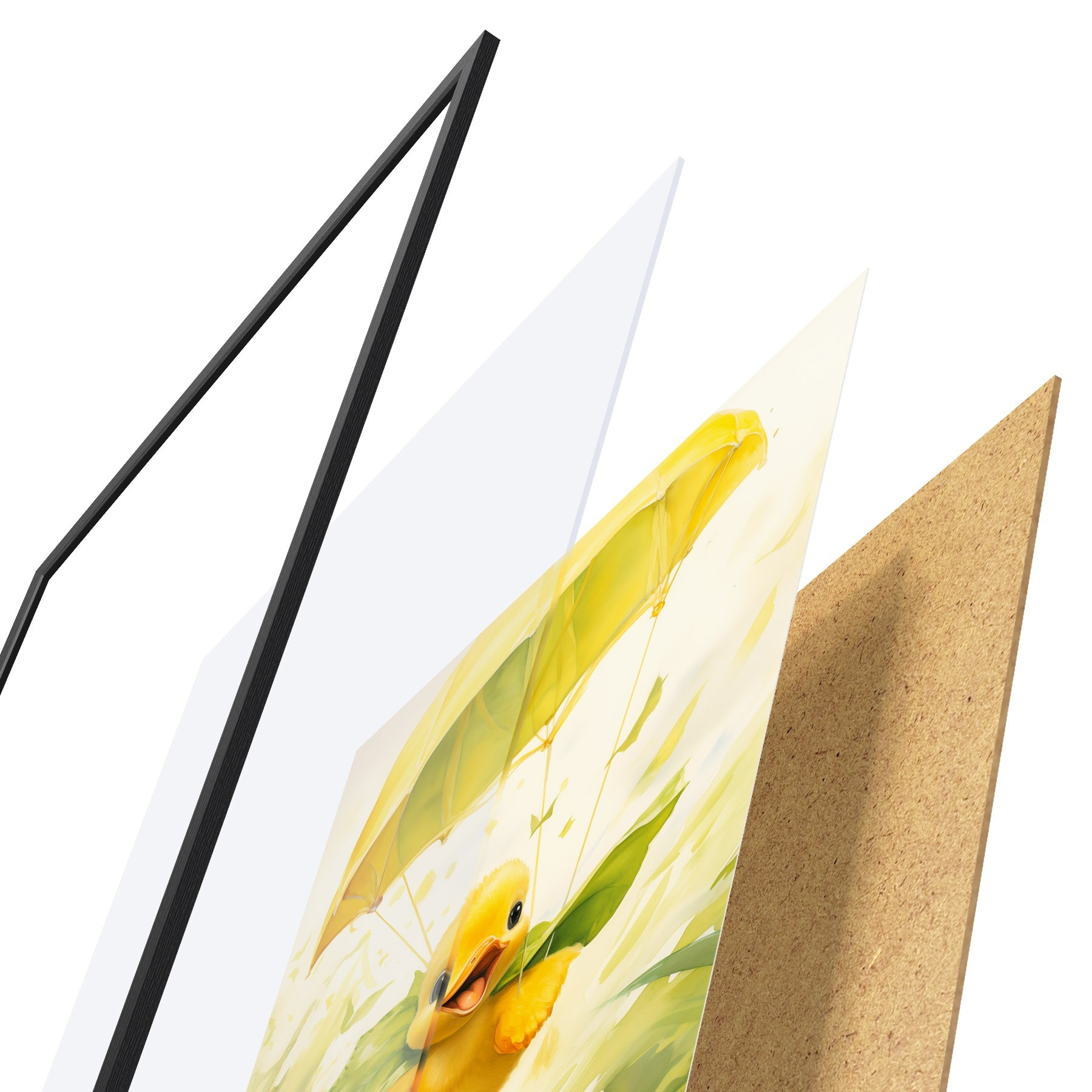 Das Poster besteht aus einem Rahmen, Plexiglas, einem gedruckten Bild und einer Rückwand aus Spanplatten. Dank der Halterungen auf der Rückseite kann das Poster sofort an die Wand gehängt werden.