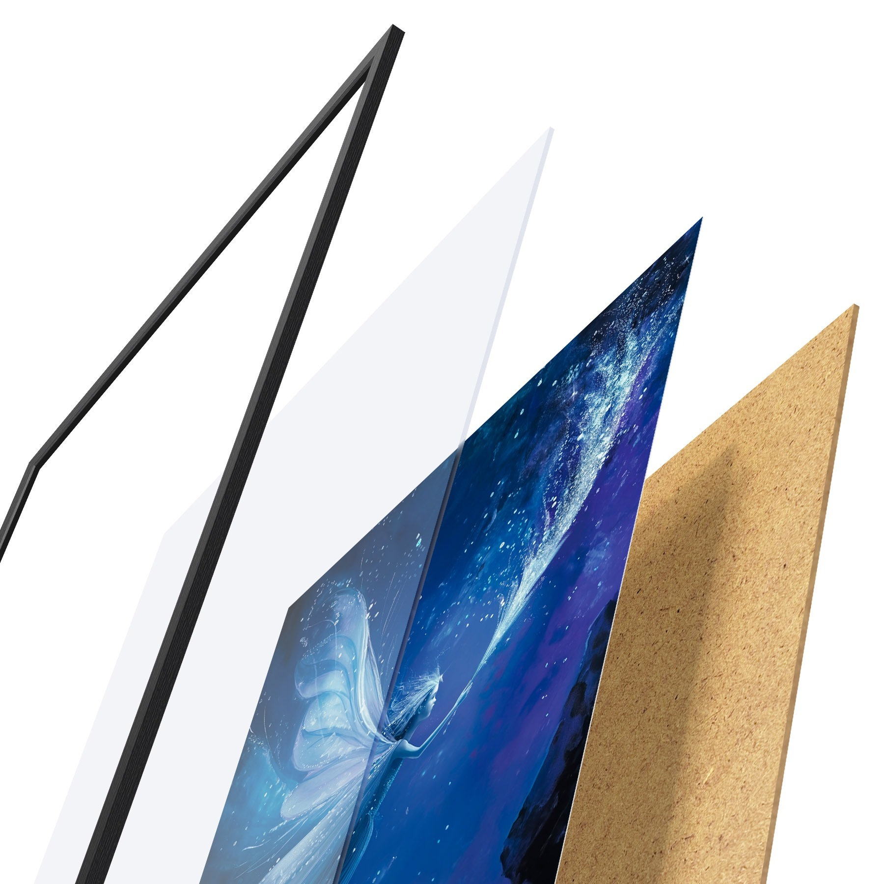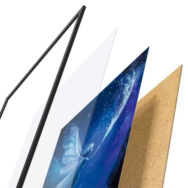 Das Poster besteht aus einem Rahmen, Plexiglas, einem gedruckten Bild und einer Rückwand aus Spanplatten. Dank der Halterungen auf der Rückseite kann das Poster sofort an die Wand gehängt werden.