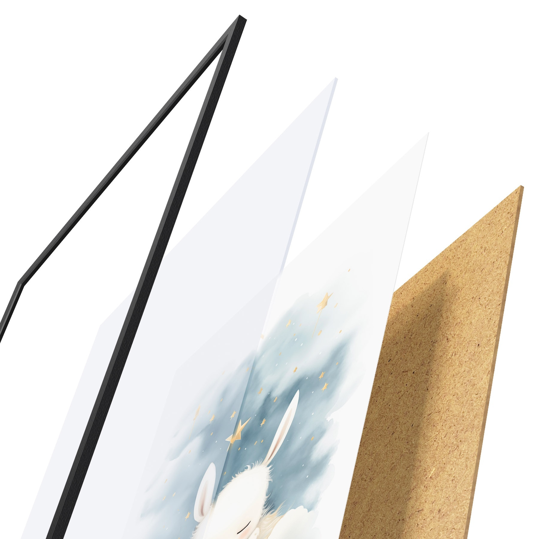 Das Poster besteht aus einem Rahmen, Plexiglas, einem gedruckten Bild und einer Rückwand aus Spanplatten. Dank der Halterungen auf der Rückseite kann das Poster sofort an die Wand gehängt werden.