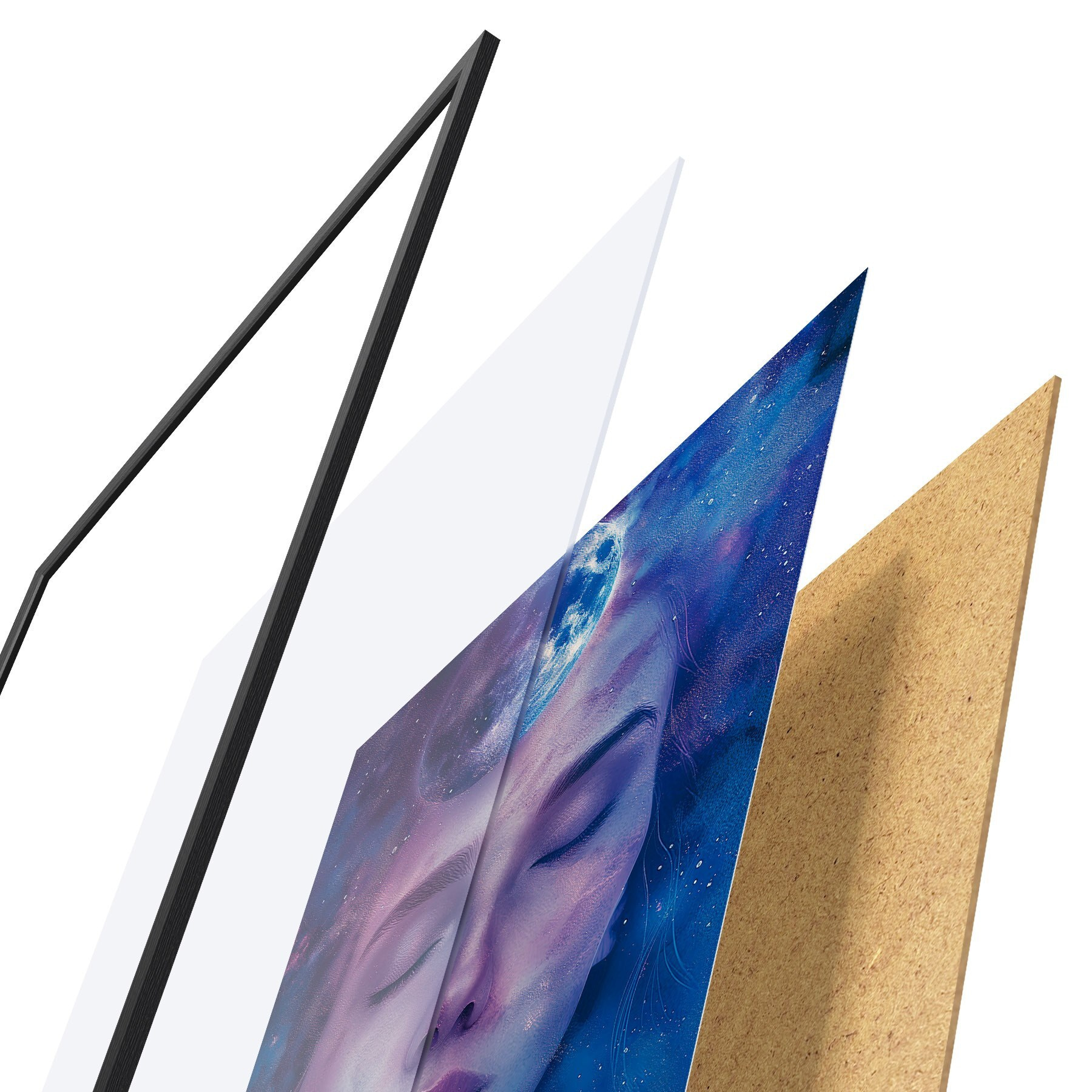 Das Poster besteht aus einem Rahmen, Plexiglas, einem gedruckten Bild und einer Rückwand aus Spanplatten. Dank der Halterungen auf der Rückseite kann das Poster sofort an die Wand gehängt werden.