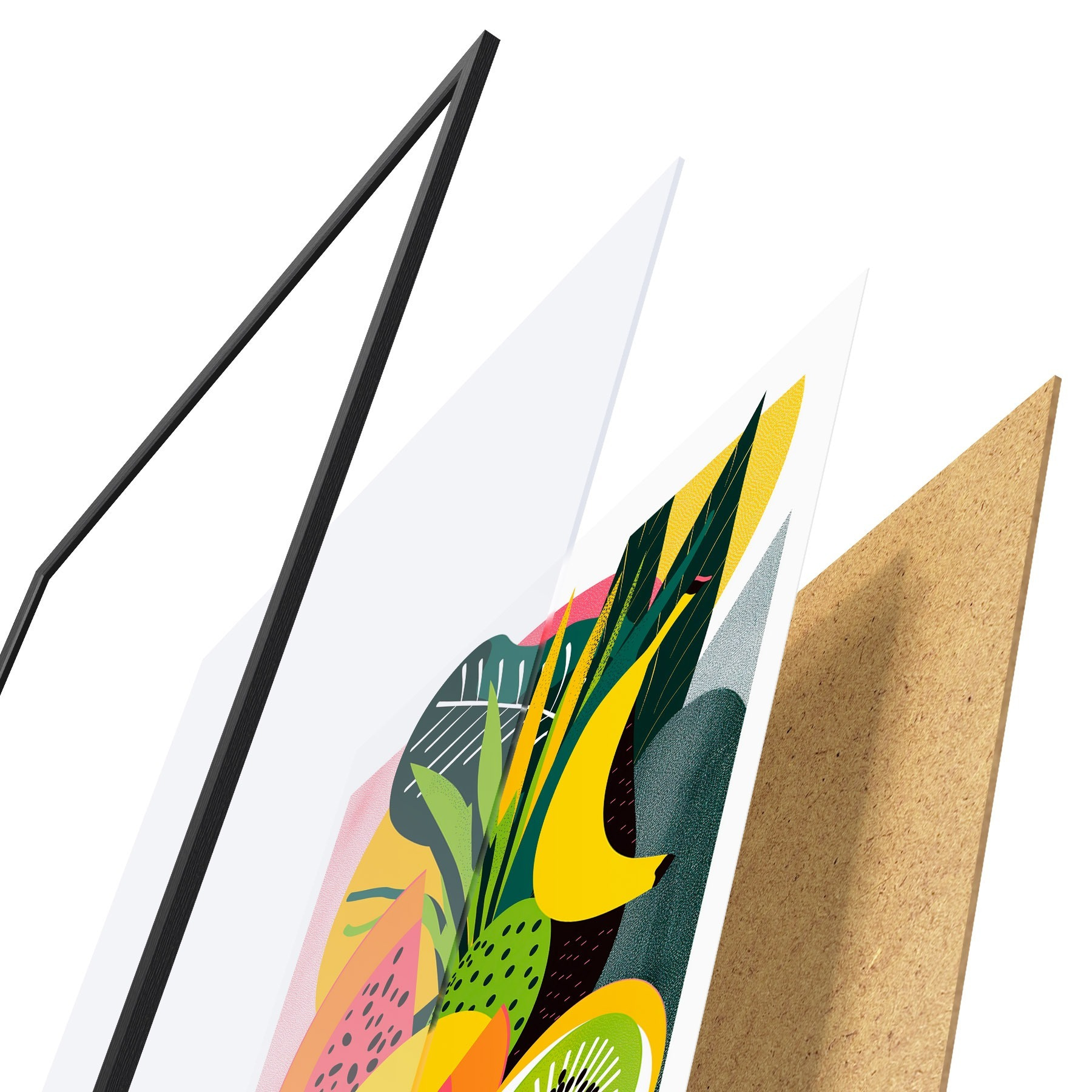 Das Poster besteht aus einem Rahmen, Plexiglas, einem gedruckten Bild und einer Rückwand aus Spanplatten. Dank der Halterungen auf der Rückseite kann das Poster sofort an die Wand gehängt werden.