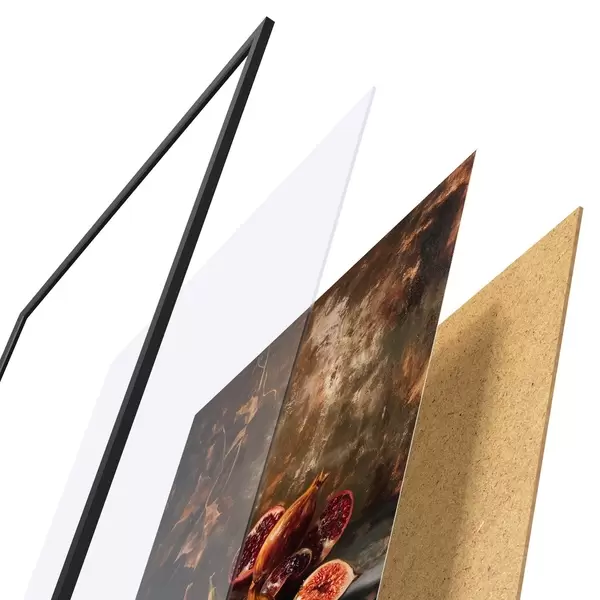 Das Poster besteht aus einem Rahmen, Plexiglas, einem gedruckten Bild und einer Rückwand aus Spanplatten. Dank der Halterungen auf der Rückseite kann das Poster sofort an die Wand gehängt werden.