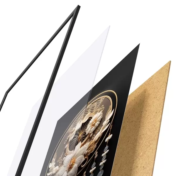 Das Poster besteht aus einem Rahmen, Plexiglas, einem gedruckten Bild und einer Rückwand aus Spanplatten. Dank der Halterungen auf der Rückseite kann das Poster sofort an die Wand gehängt werden.