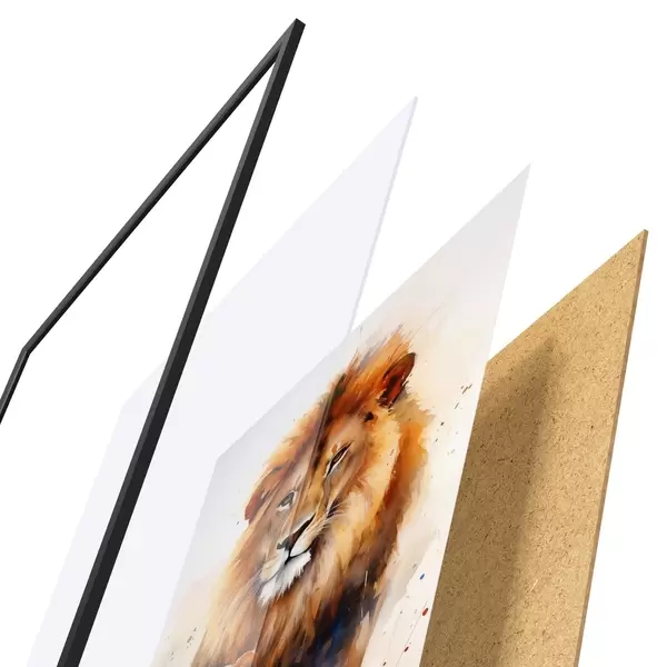 Das Poster besteht aus einem Rahmen, Plexiglas, einem gedruckten Bild und einer Rückwand aus Spanplatten. Dank der Halterungen auf der Rückseite kann das Poster sofort an die Wand gehängt werden.