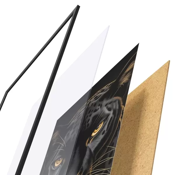 Das Poster besteht aus einem Rahmen, Plexiglas, einem gedruckten Bild und einer Rückwand aus Spanplatten. Dank der Halterungen auf der Rückseite kann das Poster sofort an die Wand gehängt werden.