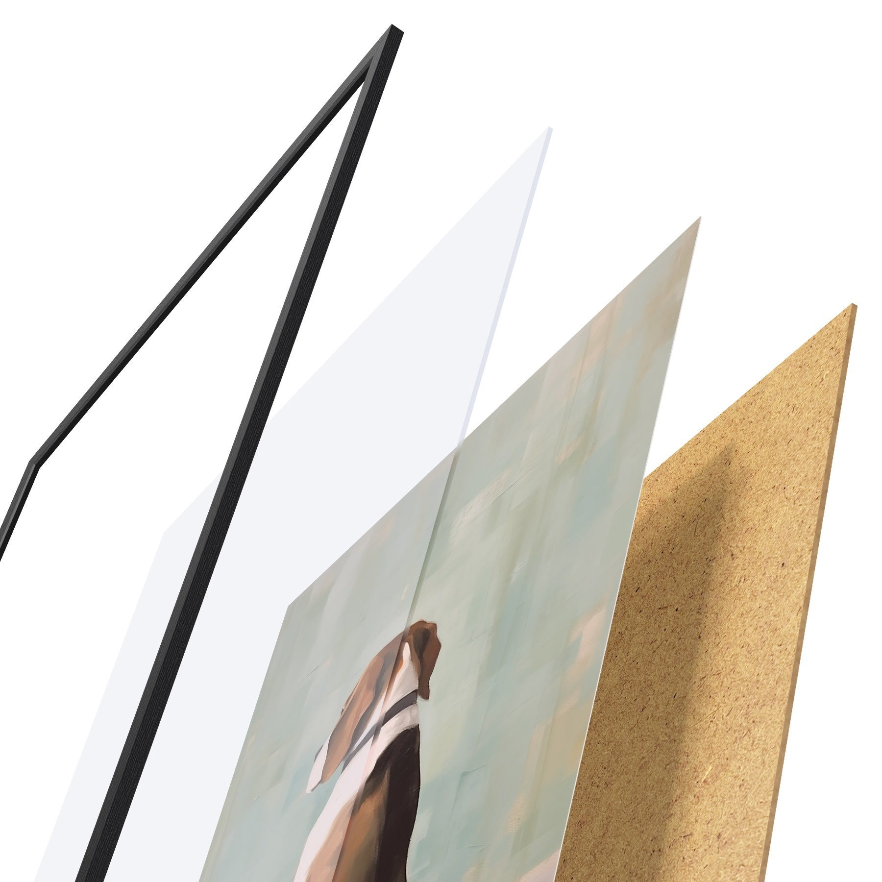 Das Poster besteht aus einem Rahmen, Plexiglas, einem gedruckten Bild und einer Rückwand aus Spanplatten. Dank der Halterungen auf der Rückseite kann das Poster sofort an die Wand gehängt werden.