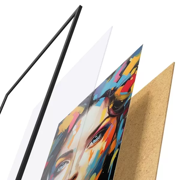 Das Poster besteht aus einem Rahmen, Plexiglas, einem gedruckten Bild und einer Rückwand aus Spanplatten. Dank der Halterungen auf der Rückseite kann das Poster sofort an die Wand gehängt werden.