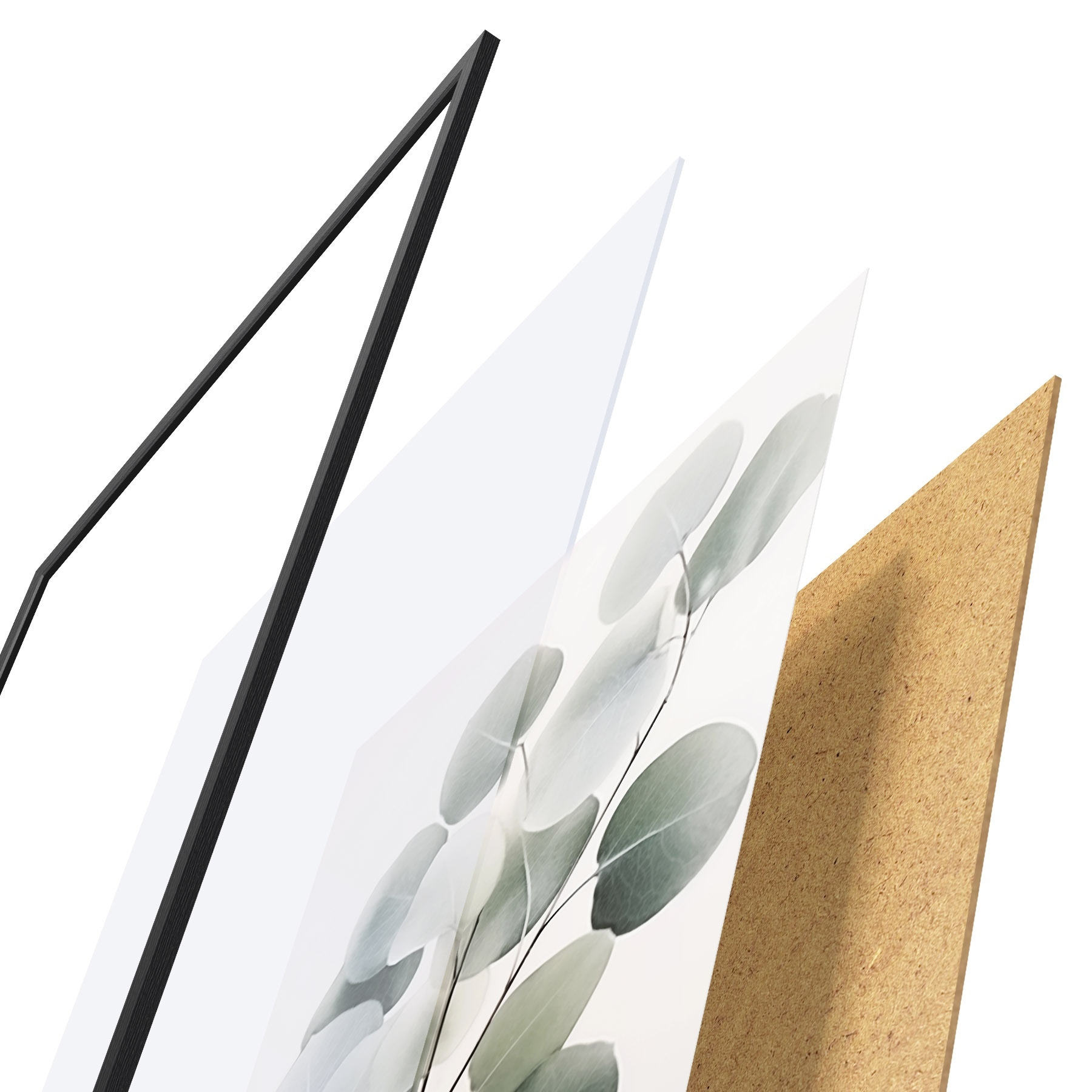 Das Poster besteht aus einem Rahmen, Plexiglas, einem gedruckten Bild und einer Rückwand aus Spanplatten. Dank der Halterungen auf der Rückseite kann das Poster sofort an die Wand gehängt werden.