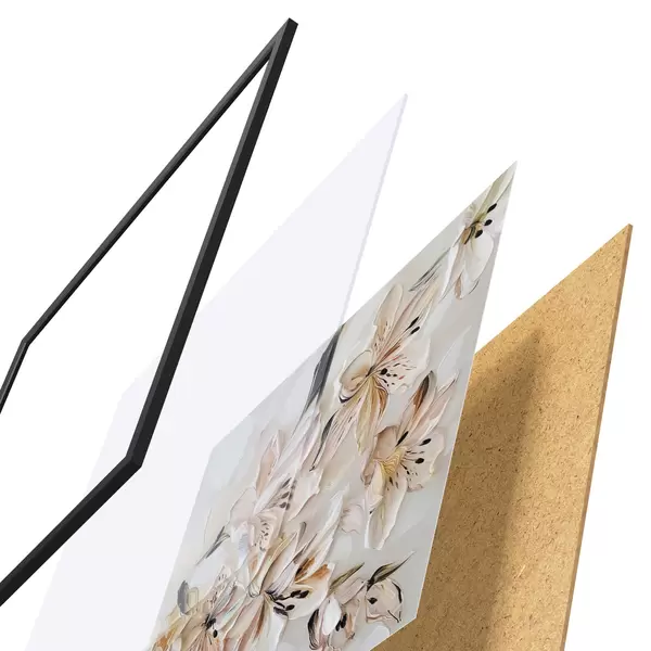 Das Poster besteht aus einem Rahmen, Plexiglas, einem gedruckten Bild und einer Rückwand aus Spanplatten. Dank der Halterungen auf der Rückseite kann das Poster sofort an die Wand gehängt werden.