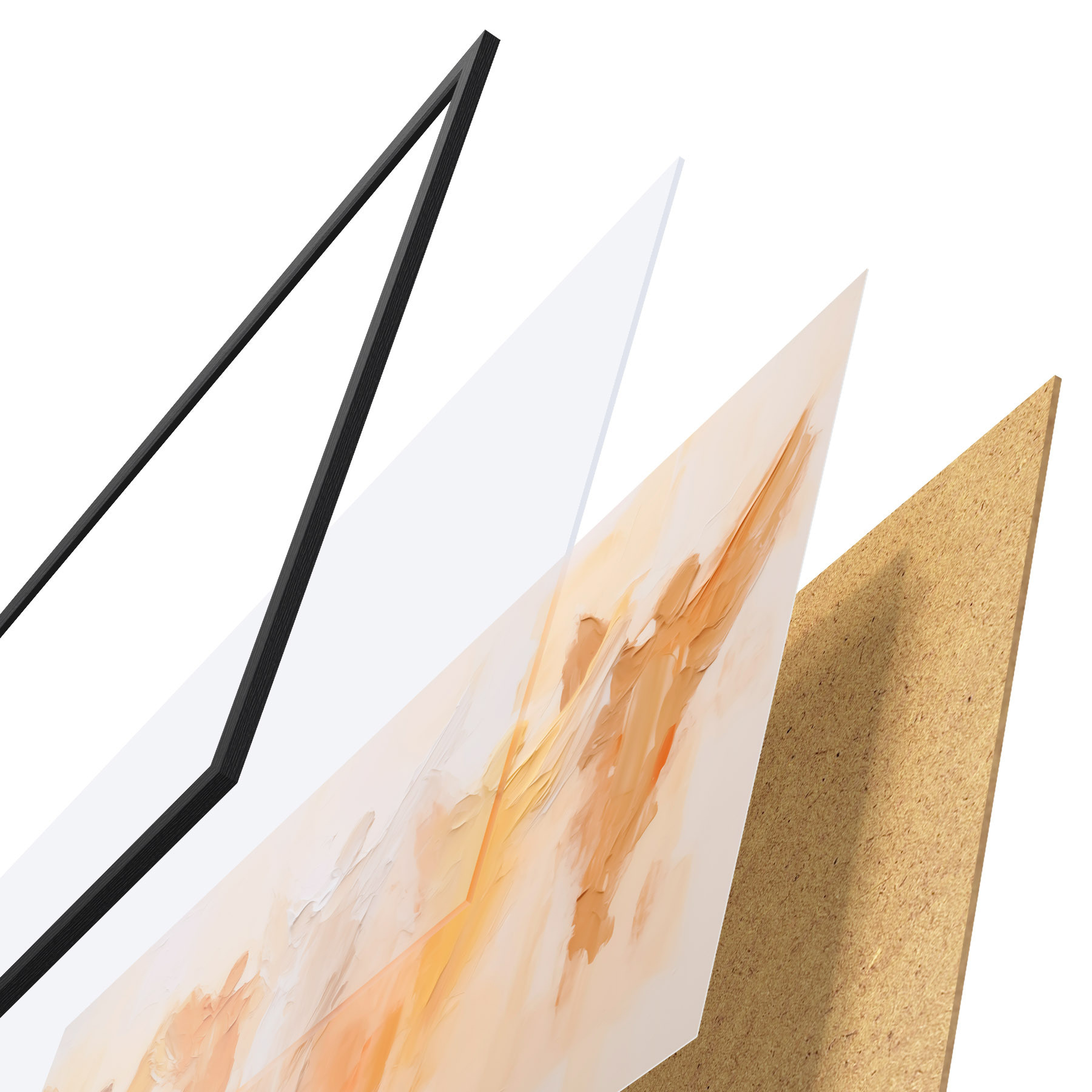 Das Poster besteht aus einem Rahmen, Plexiglas, einem gedruckten Bild und einer Rückwand aus Spanplatten. Dank der Halterungen auf der Rückseite kann das Poster sofort an die Wand gehängt werden.