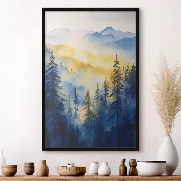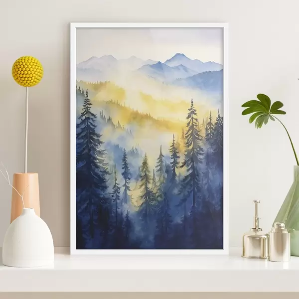 Poster Neblige Berge bei Sonnenaufgang, Kiefernwälder, blaue und gelbe Farben Nr f44602