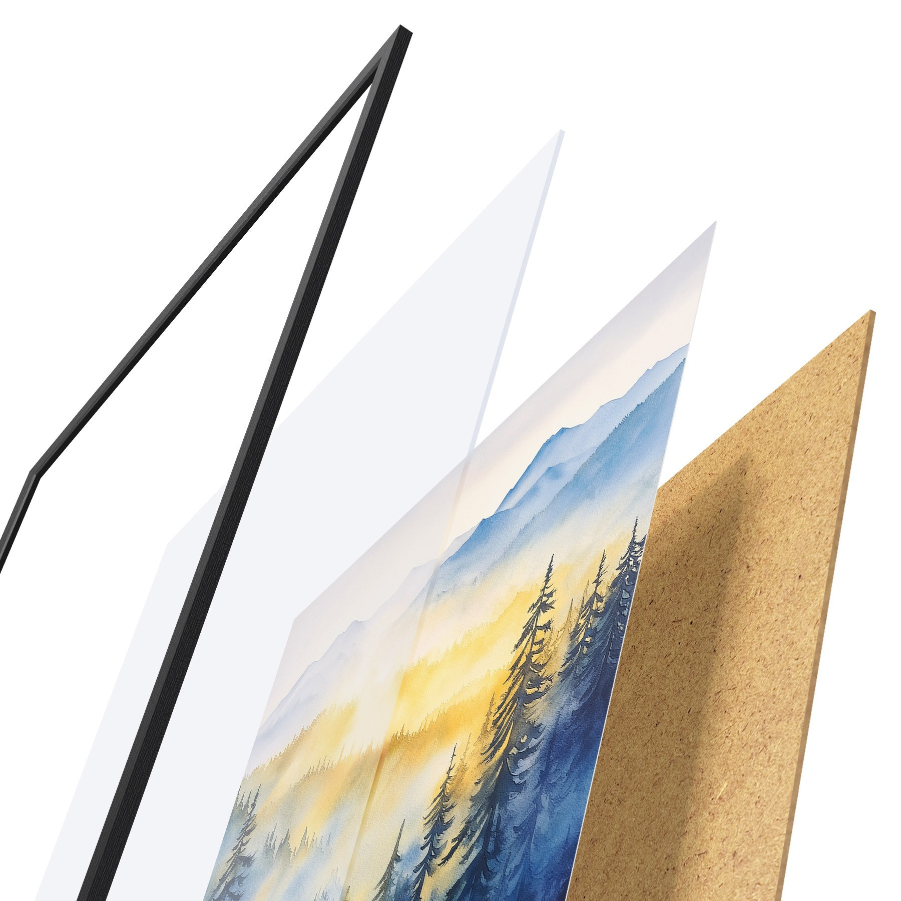 Das Poster besteht aus einem Rahmen, Plexiglas, einem gedruckten Bild und einer Rückwand aus Spanplatten. Dank der Halterungen auf der Rückseite kann das Poster sofort an die Wand gehängt werden.