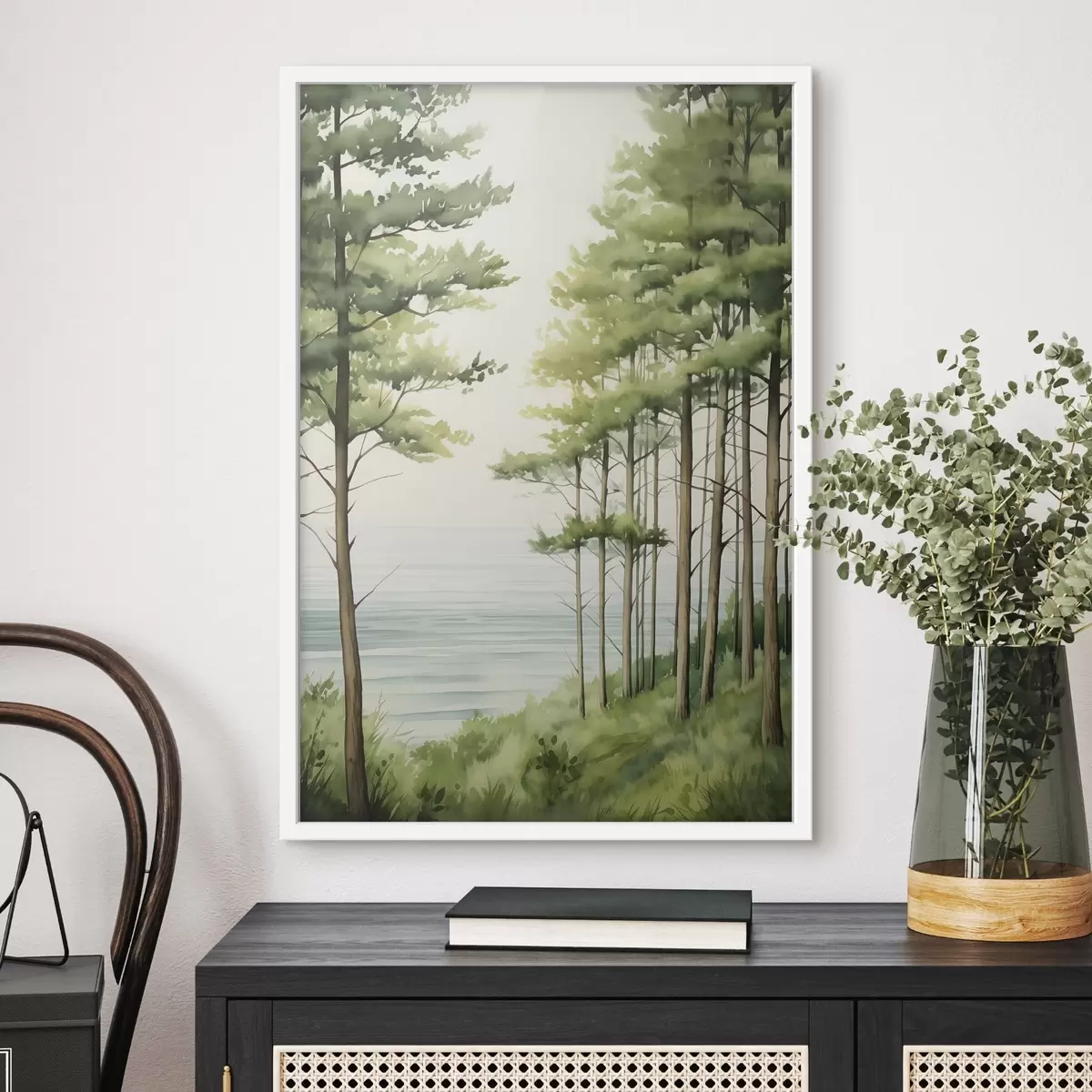 Poster Grüner Kiefernwald in der Nähe des Meeres, Aquarellstil Nr f44603