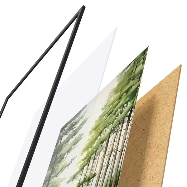 Das Poster besteht aus einem Rahmen, Plexiglas, einem gedruckten Bild und einer Rückwand aus Spanplatten. Dank der Halterungen auf der Rückseite kann das Poster sofort an die Wand gehängt werden.
