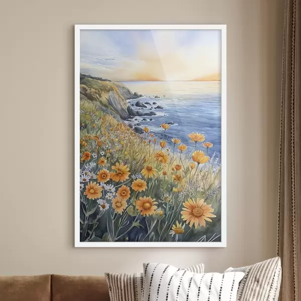 Poster Klippe mit orangefarbenen Blumen, Meeresküste, Portugal, Aquarellstil f44604