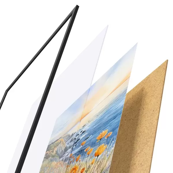 Das Poster besteht aus einem Rahmen, Plexiglas, einem gedruckten Bild und einer Rückwand aus Spanplatten. Dank der Halterungen auf der Rückseite kann das Poster sofort an die Wand gehängt werden.
