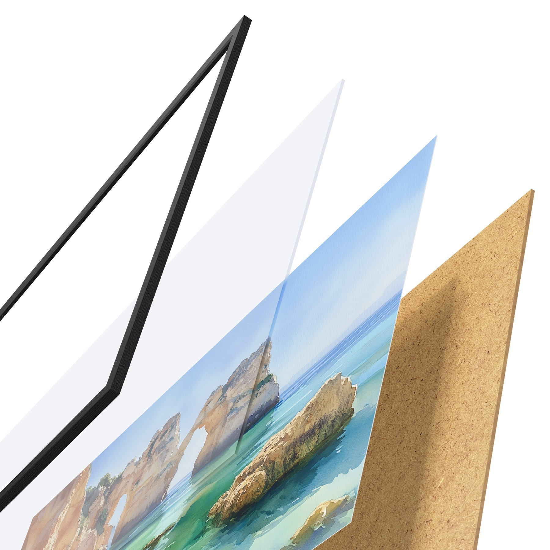 Das Poster besteht aus einem Rahmen, Plexiglas, einem gedruckten Bild und einer Rückwand aus Spanplatten. Dank der Halterungen auf der Rückseite kann das Poster sofort an die Wand gehängt werden.