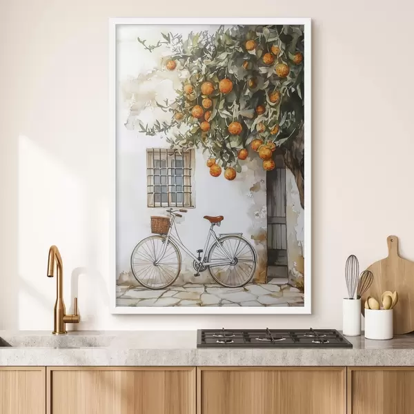 Poster Weißes mediterranes Haus mit Orangenbaum und Fahrrad Nr f44610
