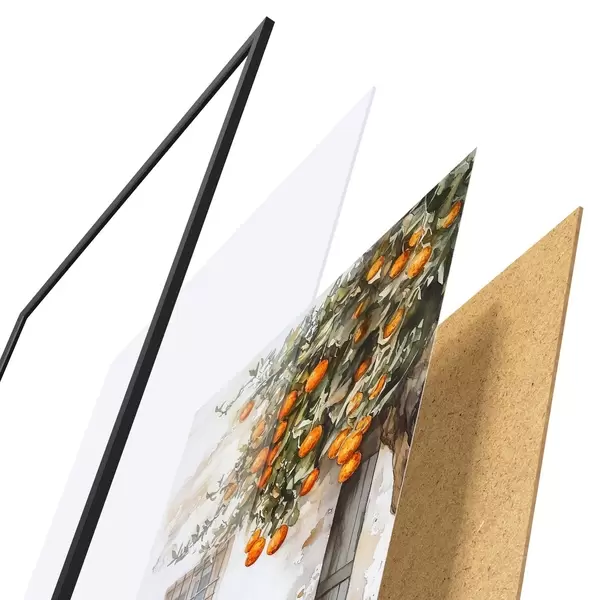 Das Poster besteht aus einem Rahmen, Plexiglas, einem gedruckten Bild und einer Rückwand aus Spanplatten. Dank der Halterungen auf der Rückseite kann das Poster sofort an die Wand gehängt werden.