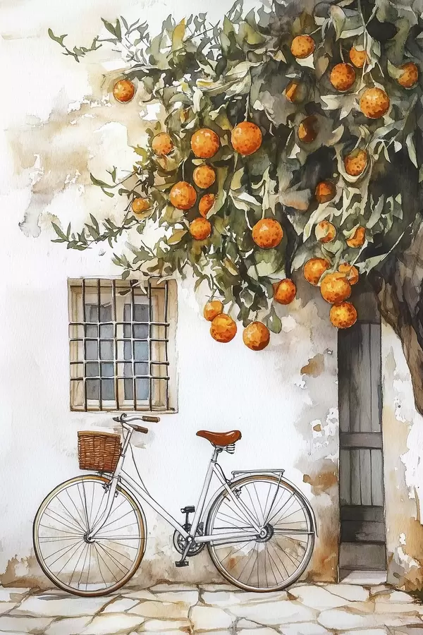 Poster Weißes mediterranes Haus mit Orangenbaum und Fahrrad Nr f44610