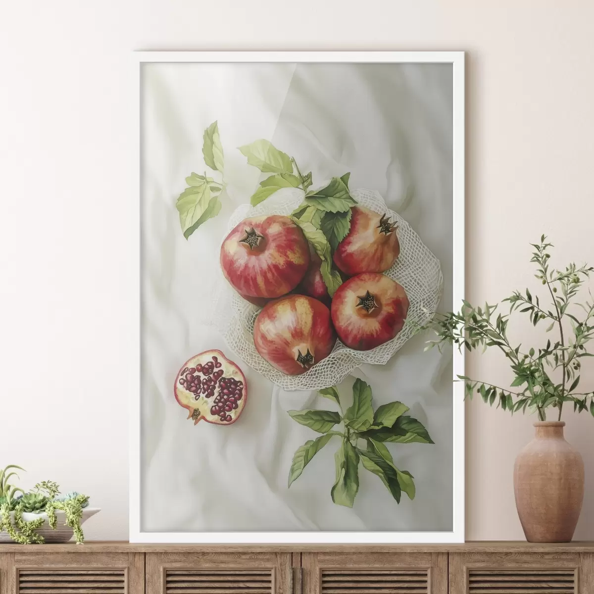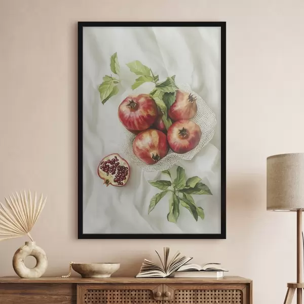 Poster Granatäpfel mit Minzblättern auf den Leinentischdecken, rustikaler Stil f44611