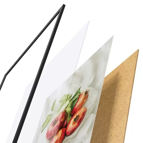 Das Poster besteht aus einem Rahmen, Plexiglas, einem gedruckten Bild und einer Rückwand aus Spanplatten. Dank der Halterungen auf der Rückseite kann das Poster sofort an die Wand gehängt werden.