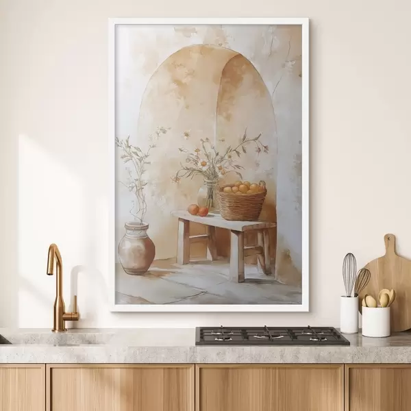 Poster Bogenwand mit antikem Krug, Kamillenblüten und Korb mit Orangen f44613
