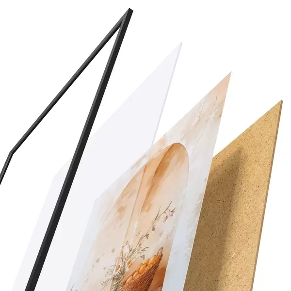 Das Poster besteht aus einem Rahmen, Plexiglas, einem gedruckten Bild und einer Rückwand aus Spanplatten. Dank der Halterungen auf der Rückseite kann das Poster sofort an die Wand gehängt werden.
