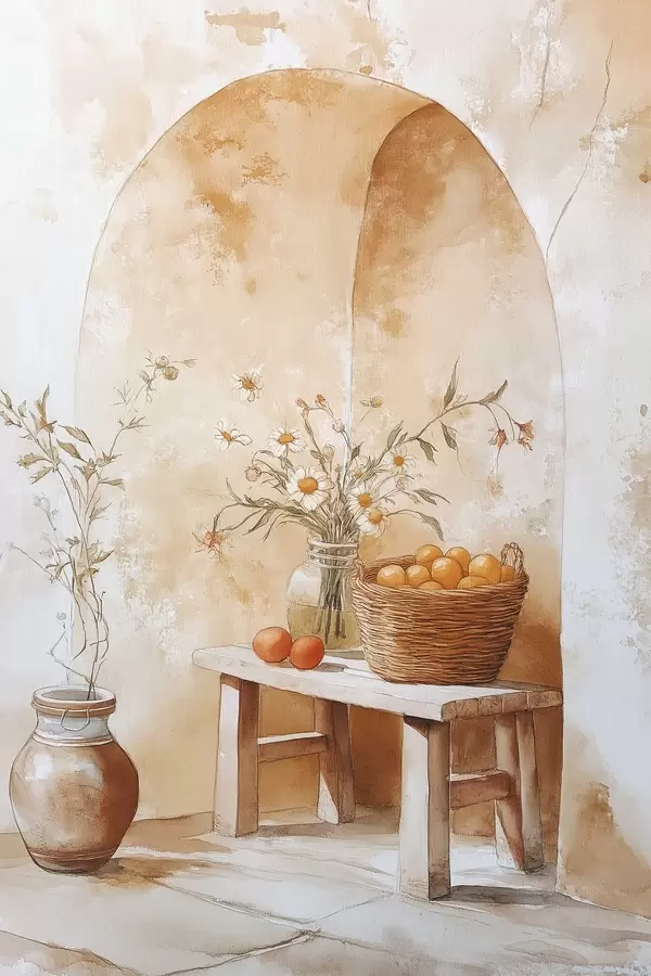 Poster Bogenwand mit antikem Krug, Kamillenblüten und Korb mit Orangen f44613