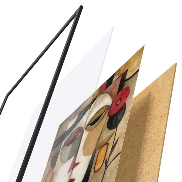 Das Poster besteht aus einem Rahmen, Plexiglas, einem gedruckten Bild und einer Rückwand aus Spanplatten. Dank der Halterungen auf der Rückseite kann das Poster sofort an die Wand gehängt werden.
