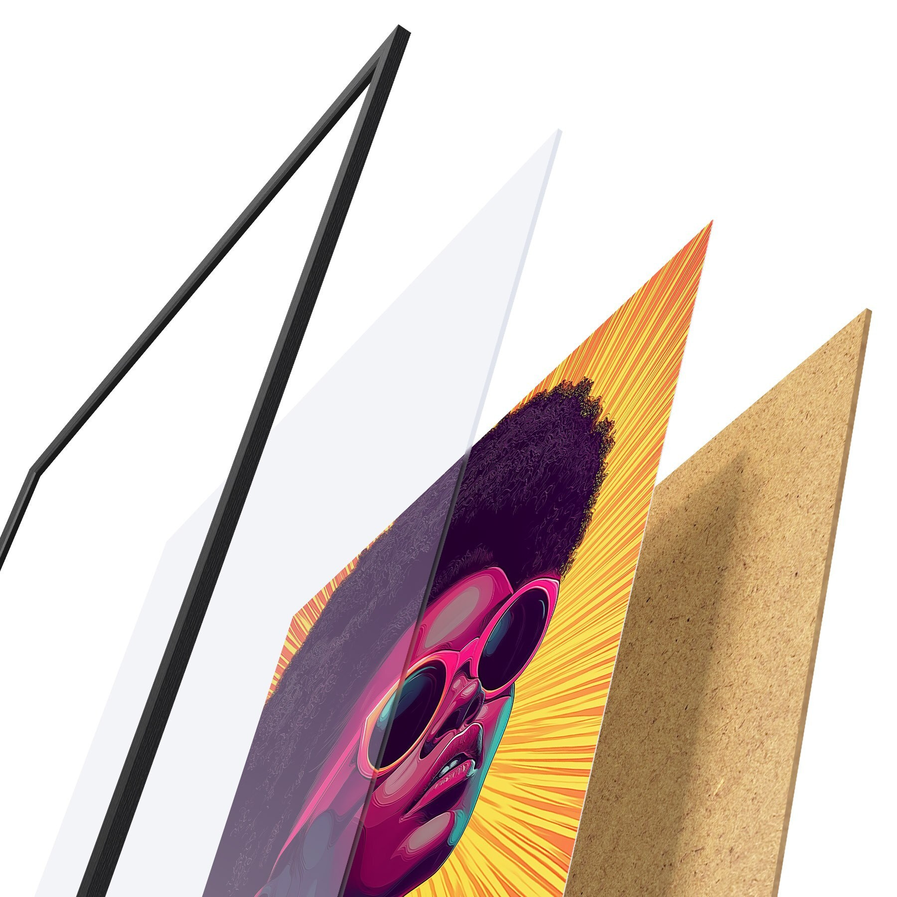 Das Poster besteht aus einem Rahmen, Plexiglas, einem gedruckten Bild und einer Rückwand aus Spanplatten. Dank der Halterungen auf der Rückseite kann das Poster sofort an die Wand gehängt werden.