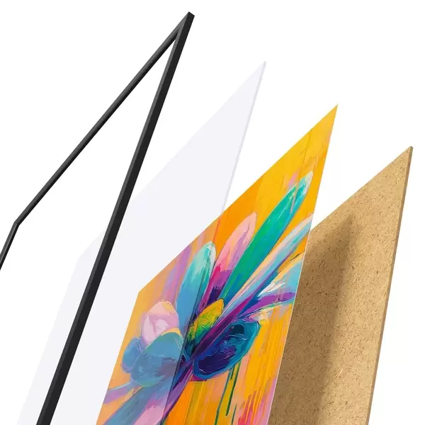 Das Poster besteht aus einem Rahmen, Plexiglas, einem gedruckten Bild und einer Rückwand aus Spanplatten. Dank der Halterungen auf der Rückseite kann das Poster sofort an die Wand gehängt werden.