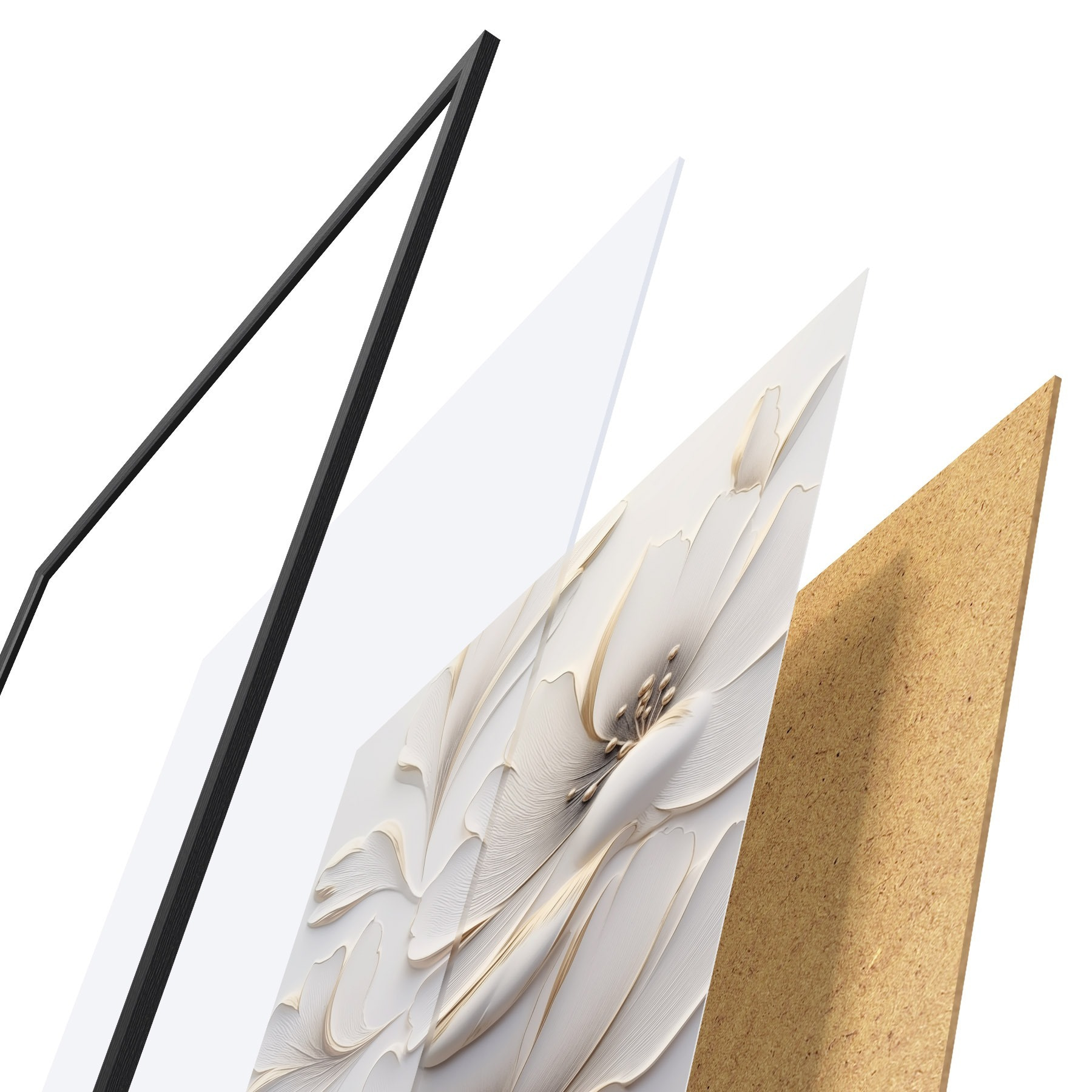 Das Poster besteht aus einem Rahmen, Plexiglas, einem gedruckten Bild und einer Rückwand aus Spanplatten. Dank der Halterungen auf der Rückseite kann das Poster sofort an die Wand gehängt werden.
