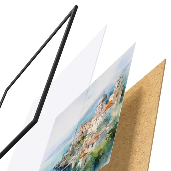 Das Poster besteht aus einem Rahmen, Plexiglas, einem gedruckten Bild und einer Rückwand aus Spanplatten. Dank der Halterungen auf der Rückseite kann das Poster sofort an die Wand gehängt werden.