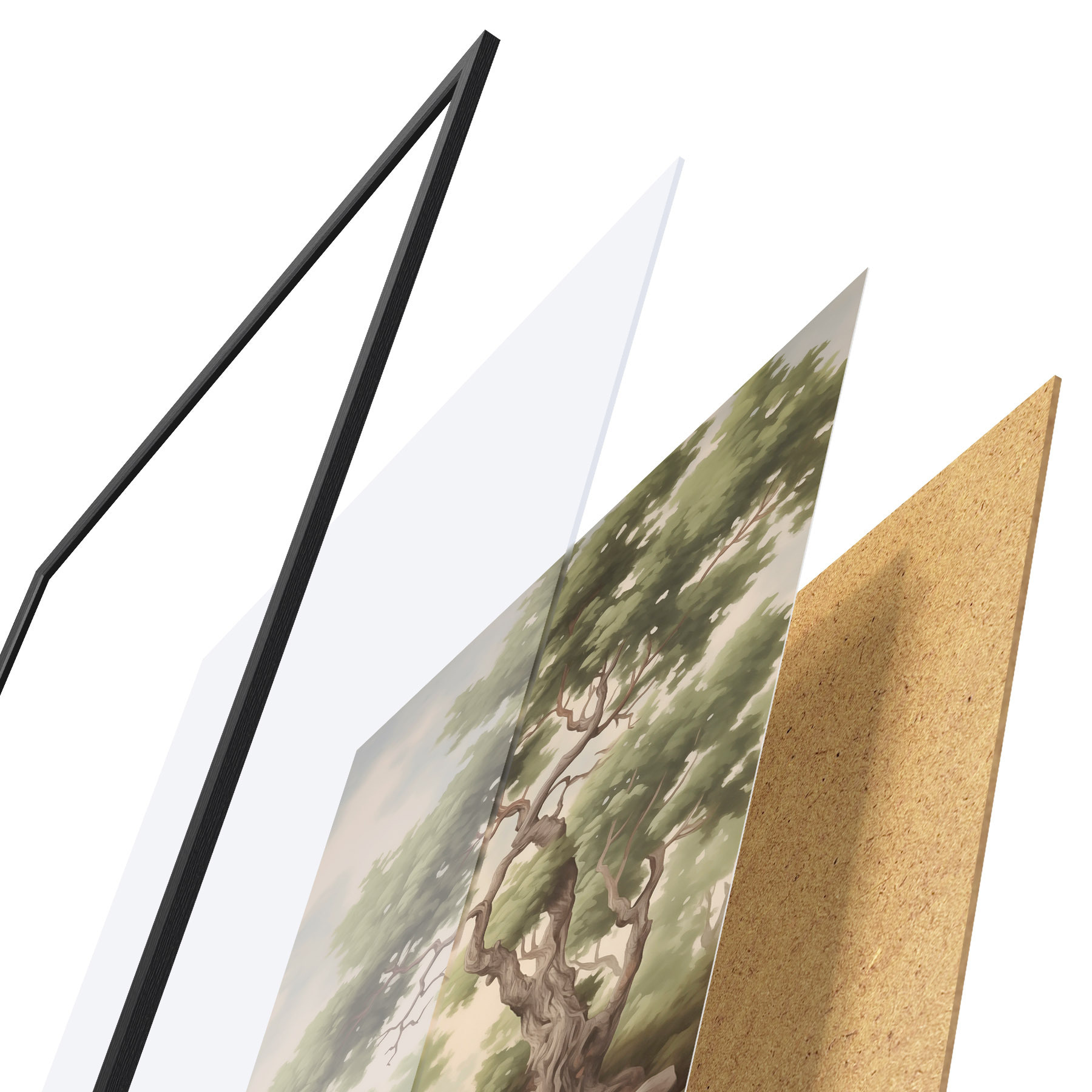 Das Poster besteht aus einem Rahmen, Plexiglas, einem gedruckten Bild und einer Rückwand aus Spanplatten. Dank der Halterungen auf der Rückseite kann das Poster sofort an die Wand gehängt werden.