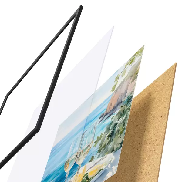 Das Poster besteht aus einem Rahmen, Plexiglas, einem gedruckten Bild und einer Rückwand aus Spanplatten. Dank der Halterungen auf der Rückseite kann das Poster sofort an die Wand gehängt werden.