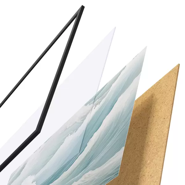 Das Poster besteht aus einem Rahmen, Plexiglas, einem gedruckten Bild und einer Rückwand aus Spanplatten. Dank der Halterungen auf der Rückseite kann das Poster sofort an die Wand gehängt werden.