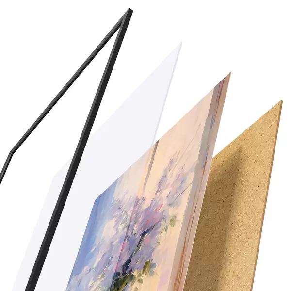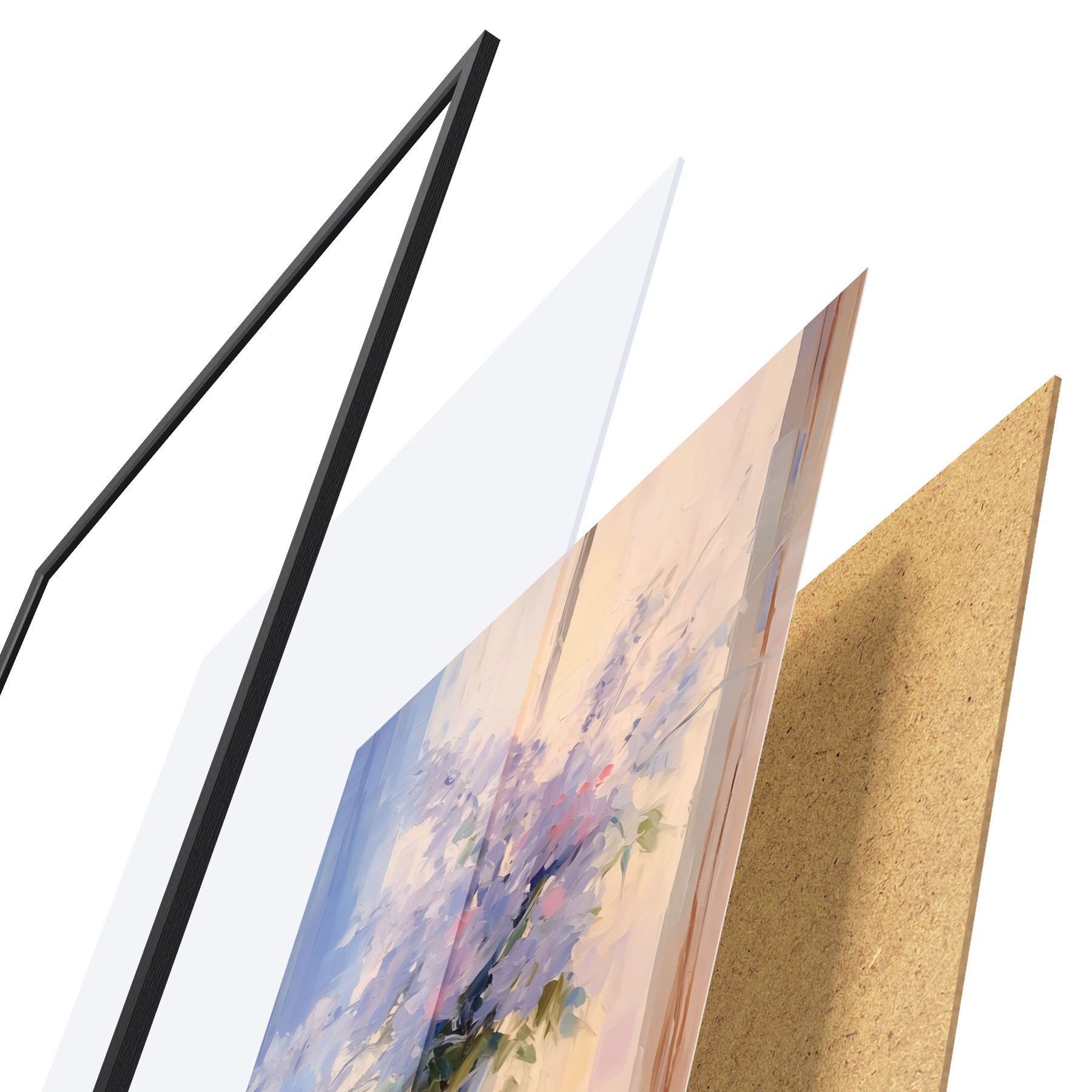 Das Poster besteht aus einem Rahmen, Plexiglas, einem gedruckten Bild und einer Rückwand aus Spanplatten. Dank der Halterungen auf der Rückseite kann das Poster sofort an die Wand gehängt werden.