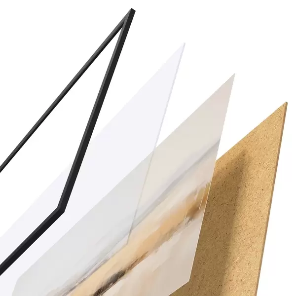 Das Poster besteht aus einem Rahmen, Plexiglas, einem gedruckten Bild und einer Rückwand aus Spanplatten. Dank der Halterungen auf der Rückseite kann das Poster sofort an die Wand gehängt werden.