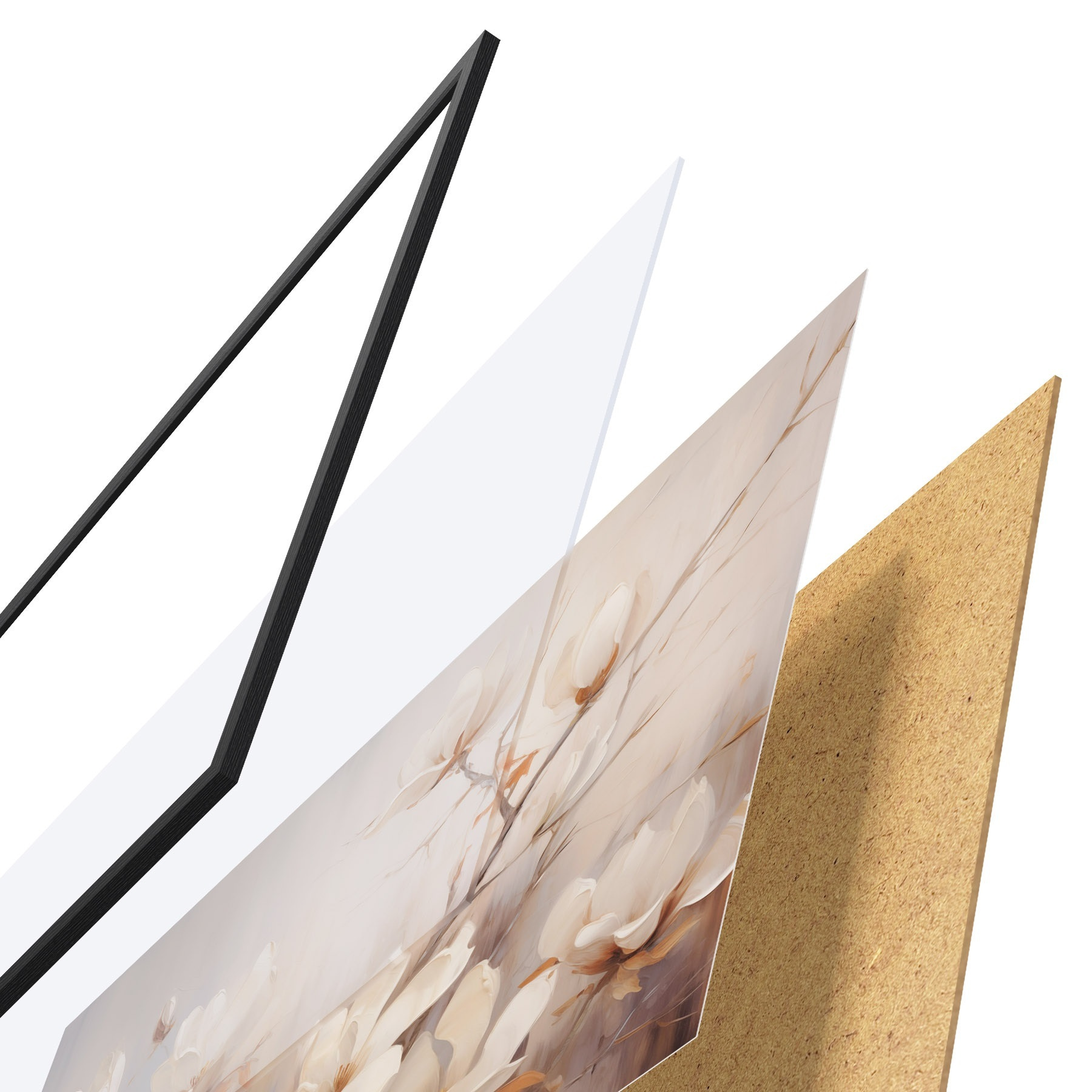 Das Poster besteht aus einem Rahmen, Plexiglas, einem gedruckten Bild und einer Rückwand aus Spanplatten. Dank der Halterungen auf der Rückseite kann das Poster sofort an die Wand gehängt werden.