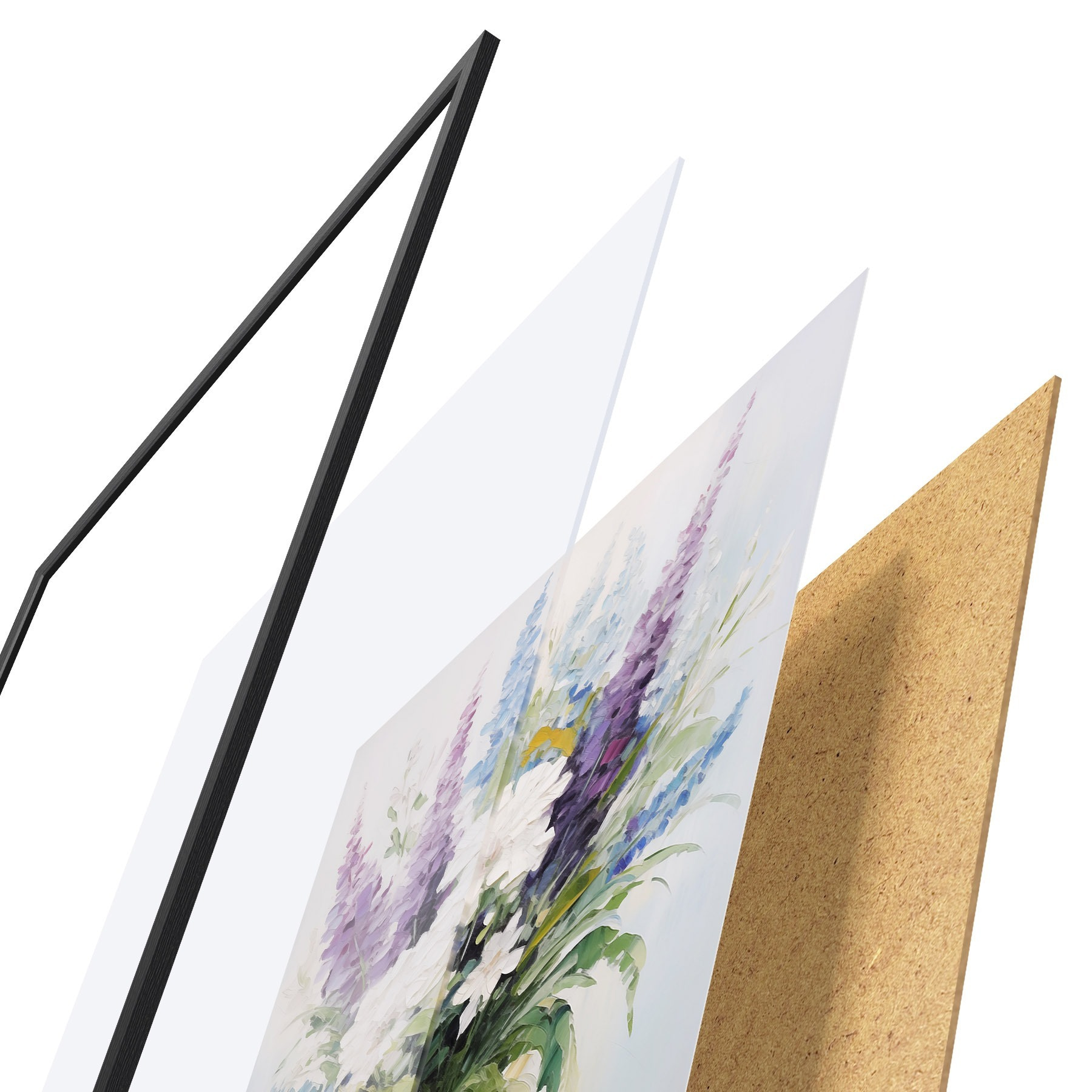 Das Poster besteht aus einem Rahmen, Plexiglas, einem gedruckten Bild und einer Rückwand aus Spanplatten. Dank der Halterungen auf der Rückseite kann das Poster sofort an die Wand gehängt werden.