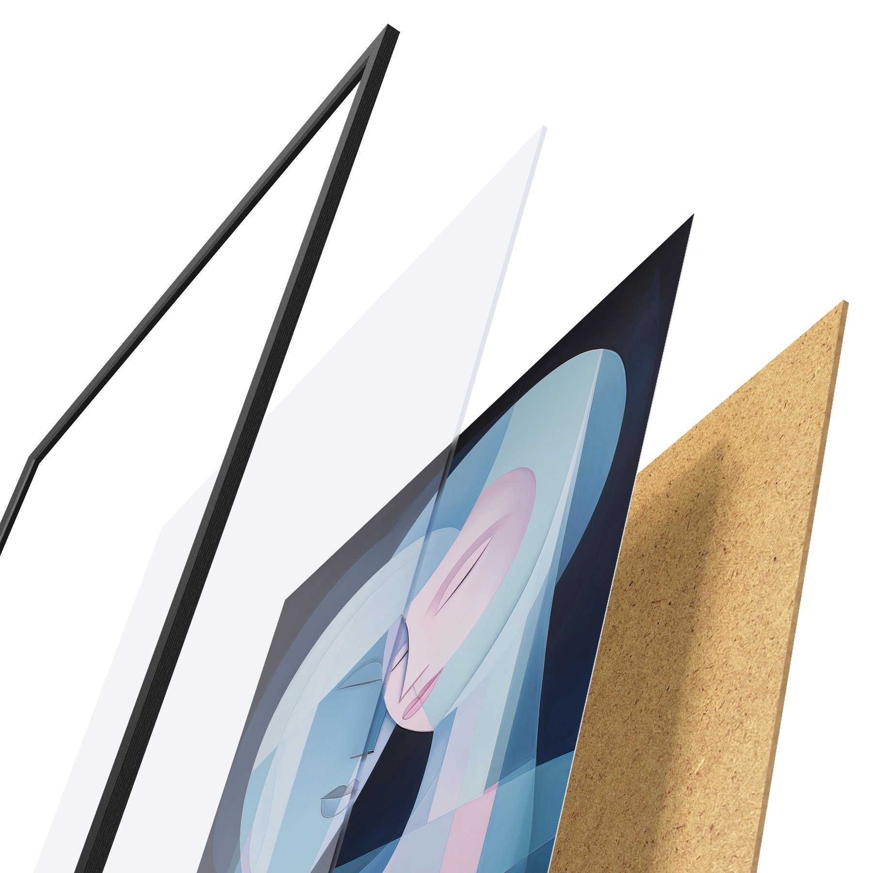 Das Poster besteht aus einem Rahmen, Plexiglas, einem gedruckten Bild und einer Rückwand aus Spanplatten. Dank der Halterungen auf der Rückseite kann das Poster sofort an die Wand gehängt werden.