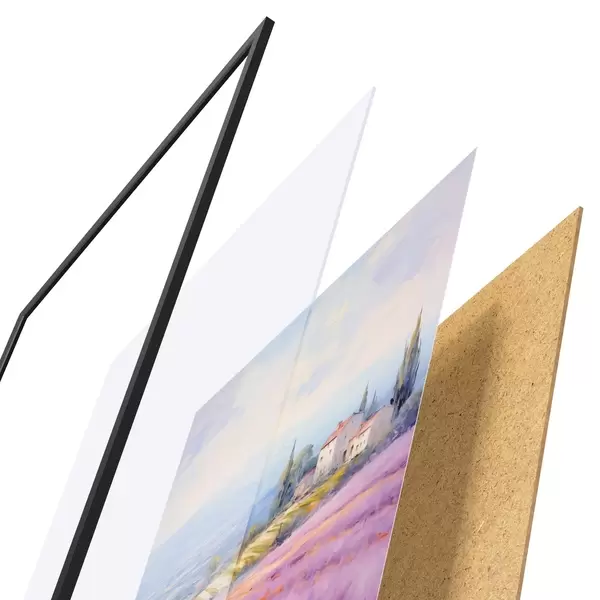 Das Poster besteht aus einem Rahmen, Plexiglas, einem gedruckten Bild und einer Rückwand aus Spanplatten. Dank der Halterungen auf der Rückseite kann das Poster sofort an die Wand gehängt werden.