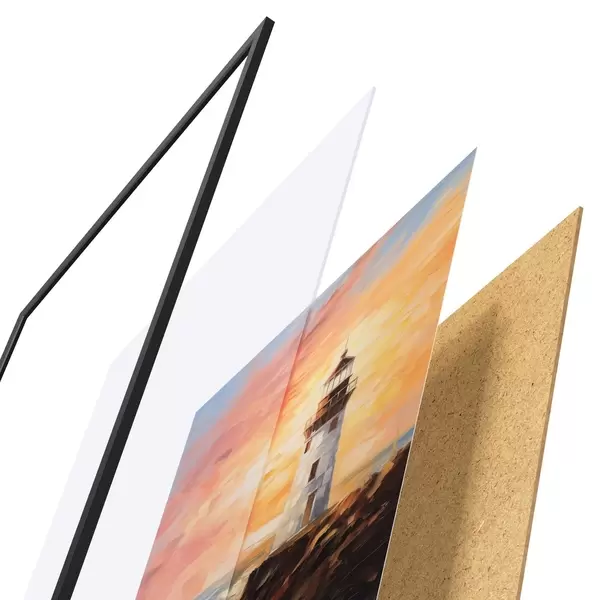 Das Poster besteht aus einem Rahmen, Plexiglas, einem gedruckten Bild und einer Rückwand aus Spanplatten. Dank der Halterungen auf der Rückseite kann das Poster sofort an die Wand gehängt werden.