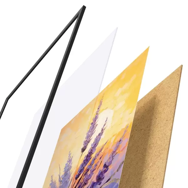 Das Poster besteht aus einem Rahmen, Plexiglas, einem gedruckten Bild und einer Rückwand aus Spanplatten. Dank der Halterungen auf der Rückseite kann das Poster sofort an die Wand gehängt werden.