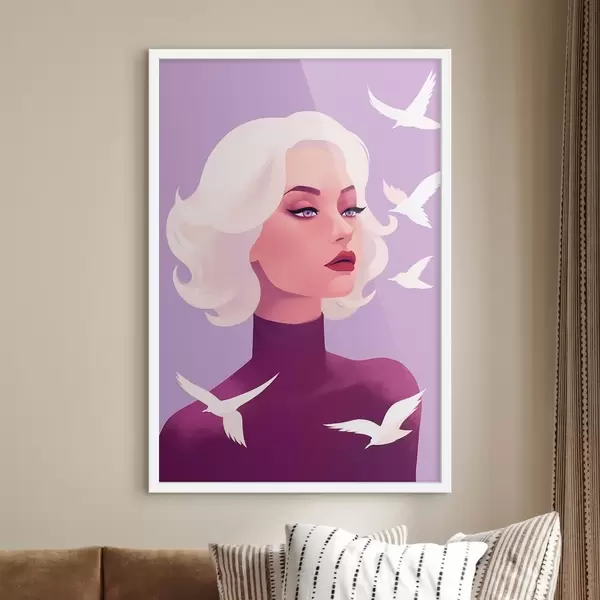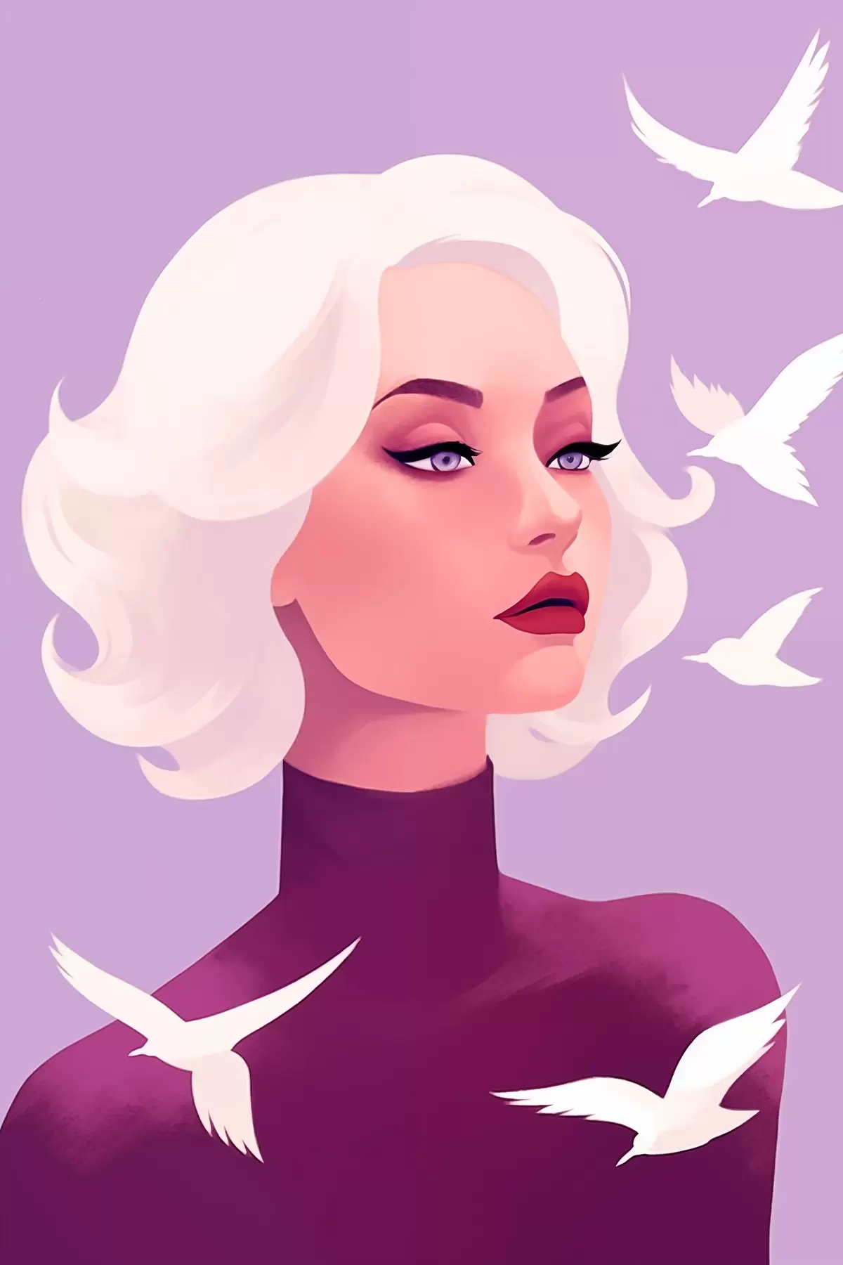 Poster Weibliches Porträt mit weißen Haaren auf dem Hintergrund mit Vögeln f44681