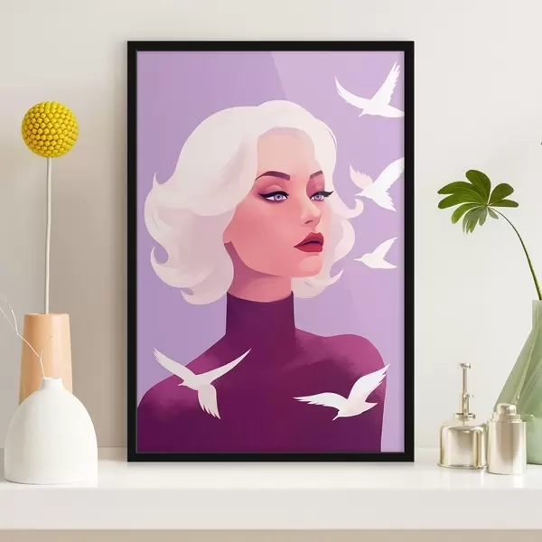 Poster Weibliches Porträt mit weißen Haaren auf dem Hintergrund mit Vögeln Nr f44681
